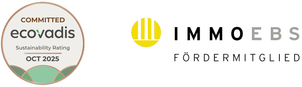 WIR VERSTEHEN NACHHALTIGKEIT als Verantwortung für Umwelt, Gesellschaft und unsere Branche. Mit dem EcoVadis Sustainability Rating bekennen wir uns zu hohen Standards in den Bereichen Umwelt, Arbeitspraktiken und ethisches Handeln. Gleichzeitig investieren wir in die Förderung junger Immobilienfachleute als Fördermitglied von Immoebs e.V., um die nächste Generation von Expertinnen und Experten aktiv zu unterstützen. So verbinden wir wirtschaftlichen Erfolg mit nachhaltigem Fortschritt – für eine verantwortungsvolle Zukunft der Bau- und Immobilienwelt.
