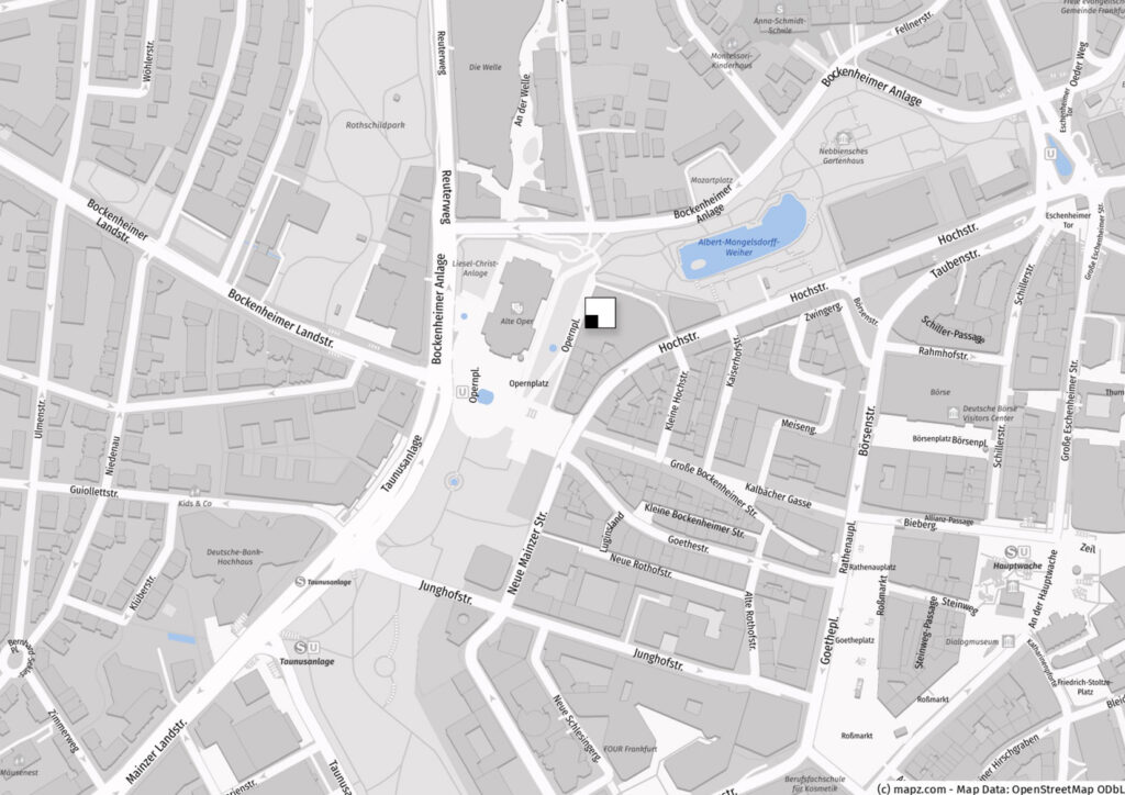 IM HERZEN DER METROPOLE. Unser Frankfurter Standort liegt in einem Umfeld, das wirtschaftliche Dynamik und internationale Strahlkraft vereint. Nur wenige Schritte vom Bankenviertel entfernt, mit optimaler Anbindung an den Hauptbahnhof und die Innenstadt, verbinden wir hier eine markante Adresse mit urbaner Energie, kurzen Wegen und einem Arbeitsumfeld, das Konzentration und Austausch gleichermaßen ermöglicht. Eingebettet in eine charmante Seitenstraße findet man uns – so viel Charakter darf sein – in einem Haus, das mit seiner klaren architektonischen Haltung sofort ins Auge fällt.